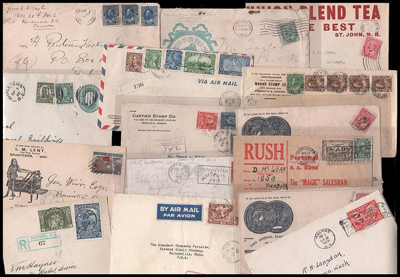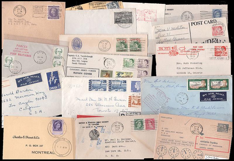 POSTAL HISTORY: Over 75 covers, 1867 to 1935, including Small Queens with 1¢, 2¢, 3¢, 5¢, and 8¢, printings, a few Large Queens, one with mixed franking, Jubilees, Maps, Edwards, George V, various cancels incl 2-RINGS with 5, 12, 15, 59, Squared Circles, double broken circles, Fancy’s with Toronto 2, Flags, targets, Registered, advertising, various destinations from local to England, Germany, quality mixed with many trimmed or missing corners. Inspect.