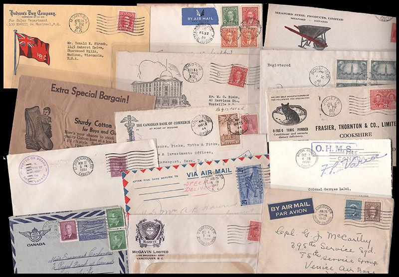 POSTAL HISTORY: Approximately 225 George VI covers including advertising, Special Delivery, Airmail, and destinations, Registered, FECB, OHMS, Flights, precancels, Stationery, meters, Military, all Provinces represented and all kind of postmark types. A bit mixed. Inspect. (Image)