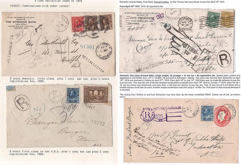 POSTAL HISTORY: Sixty ADMIRAL REGISTERED covers 1912 to 1931, loose and mounted on pages, mostly from Ontario, a myriad of rates including Free registered, drop registered, War Tax, some auxiliaries with AR, and not called for, several are Dominion Bank returned to sender, Admiral era stationery envelopes with Medallion, etc, about 10 larger envelopes, faults to be expected, but generally fine. Inspect. (Image)