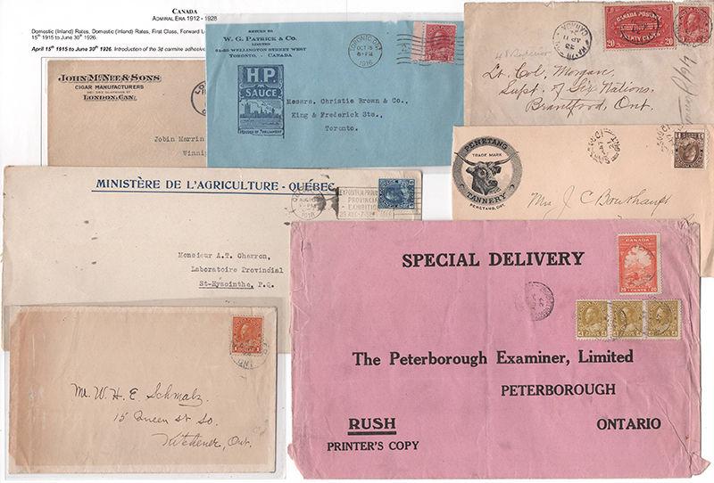 POSTAL HISTORY: 175 ADMIRAL COVERS 1912 to 1931, loose and mounted on pages, notes revealed a plate study of the early issues with plates, types etc, mostly domestic including $1.00 single franking, some postcards, precancel on piece, Special Delivery, Soldier cards, RPOs, stationery cards, booklet stamps, some advertising, 8x12, Camp Borden Field Post Office Universal machines, a lot of single letter-rated. Quality varies drastically. Inspect. (Image)
