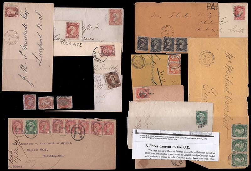 POSTAL HISTORY: Twenty-two covers or large pieces, with mostly Large and Small Queens, with 2¢ SQ on Prices Current to UK, 2¢ LQ strip of 3 on cover to Hamilton, 1¢ SQ drop at Quebec, uprated stationery cards, fancy cancels, 6¢ LQ from Barrington NS, Quebec Assist Treasurer marking, condition varies dramatically. Inspect. (Image)