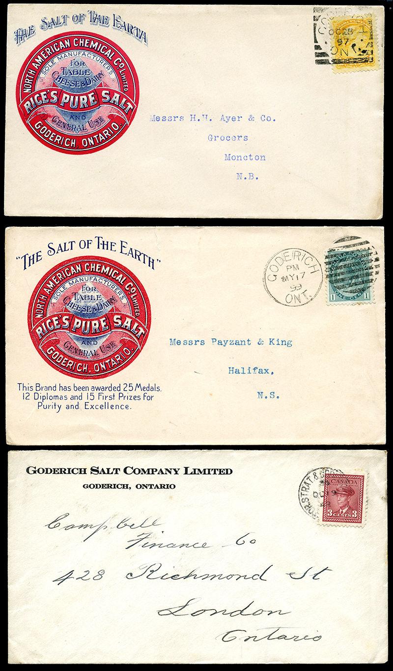 POSTAL HISTORY: Nine covers and stationery cards from various SALT companies, 1881 to 1949, with John Scobie, Salt Mfg (1881), Salt Agency (1895), Canada Salt Agency (1864), Goderich Salt Co. Ltd in 3 different fonts and colours, North American Chemical Co Ltd (1897, 1899, 1908), 1908 with enclosure, bright colours, f-vf. (Image)