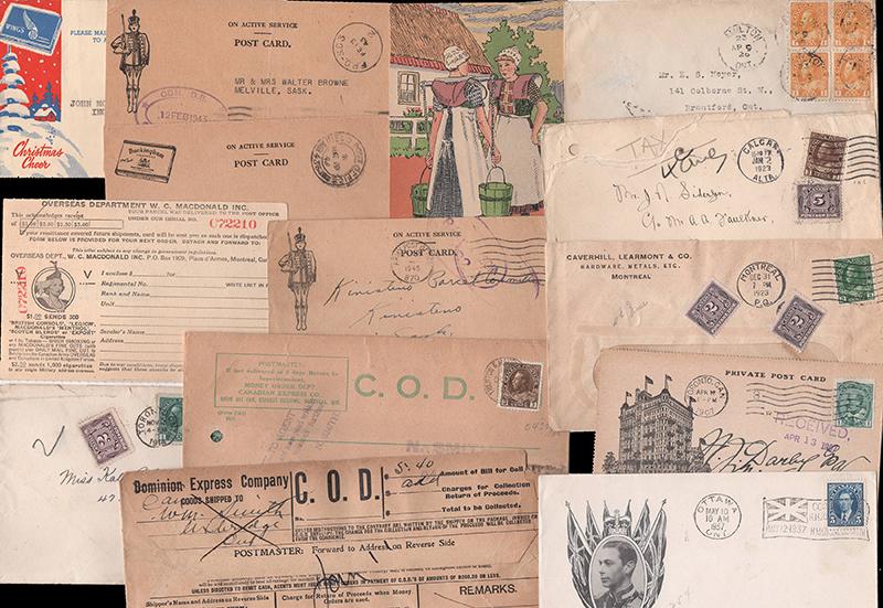 POSTAL HISTORY: 350 covers and cards, incl Beaver, 3¢ Admiral imperf pair on FFC, Small Queens with postmark interest, Admiral coils, registered, and War Tax, Silver Jubilee FDCs, auxiliary, general stationery, a few Newfoundland, 1¢ Quebec, Niagara Camp 1910, postcards with RPO, 1950s to 1970s cacheted FDCs (one signed by Joseph Howe 1972), COD covers, coronation flag cancels, Postage Due, advertising, etc. Quality varies, generally f-vf. Inspect. (Image)