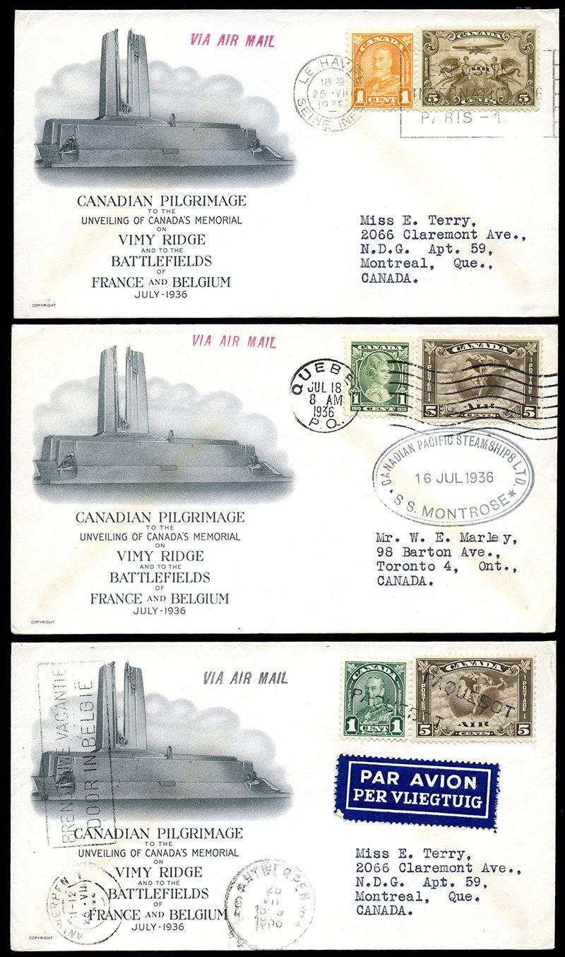 POSTAL HISTORY: 162,211,212,214,C1-C3,C5: Seven covers, all with same CANADIAN PLIGRIMAGE cachets, 4 with S.S. Montrose hand stamp, plus one from Belgium with red oval British Legion Haig House hand stamp, f-vf. (Image)