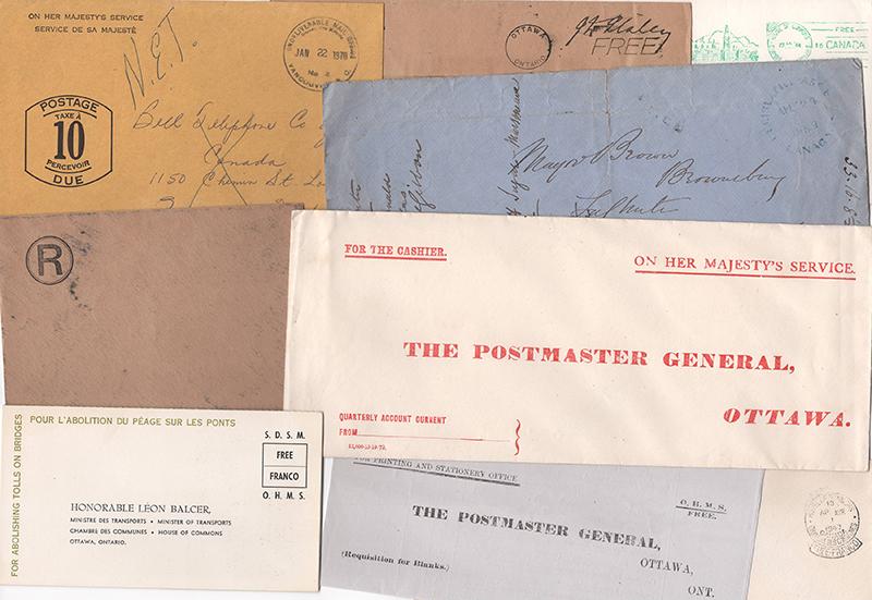 POSTAL HISTORY: Approximately 100 OFFICIAL covers, 1850s to 2000s, with cards and forms, at least half are POST OFFICE DEPARTMENT, with Legislative, House, Senate, Experimental Farm, etc, plus over 25 modern Canada Post tags and routing slips. A few US diplomatic covers, some faulty or fronts not included in total. Condition varies especially on the larger items, but generally fine. Inspect. (Image)