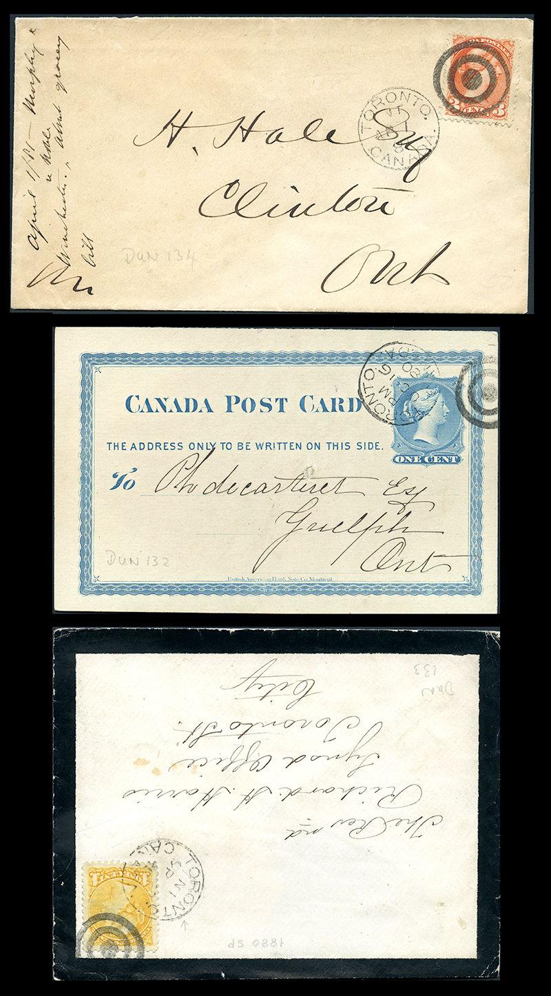 POSTAL HISTORY: 35,36,etc: Two covers and one Stationery, with Toronto UNOFFICIAL DUPLEXES (DUN 132-134), 1¢ Stationery P 16 OC 1880 to Guelph, 1¢ Small Queen ? SP 1880 on mourning cover to Toronto, and 3¢ Small Queen 1 AP 1881 to Clinton, back flap faults. (Image)