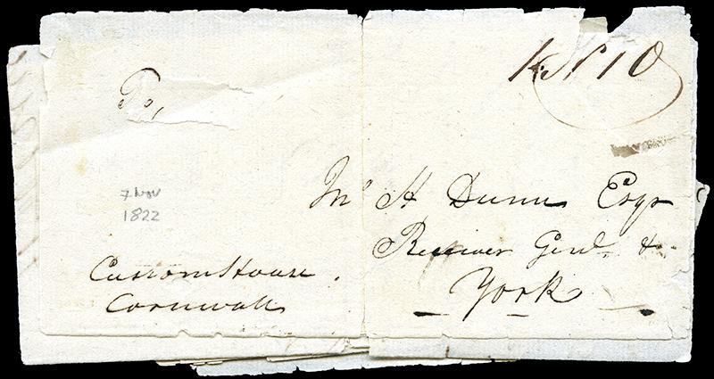 POSTAL HISTORY - STAMPLESS - UPPER CANADA: Seven letters 1841 to 1852, neatly mounted incl cross border, money letter etc incl Toronto to Plattsburgh NY, Kingston to New York, Kingston prepaid Money letter to Montreal, New York to Kingston, St. Catharines paid in blue, Bytown to Perth, Hamilton to New York, etc, fine or better. Inspect.(Image)