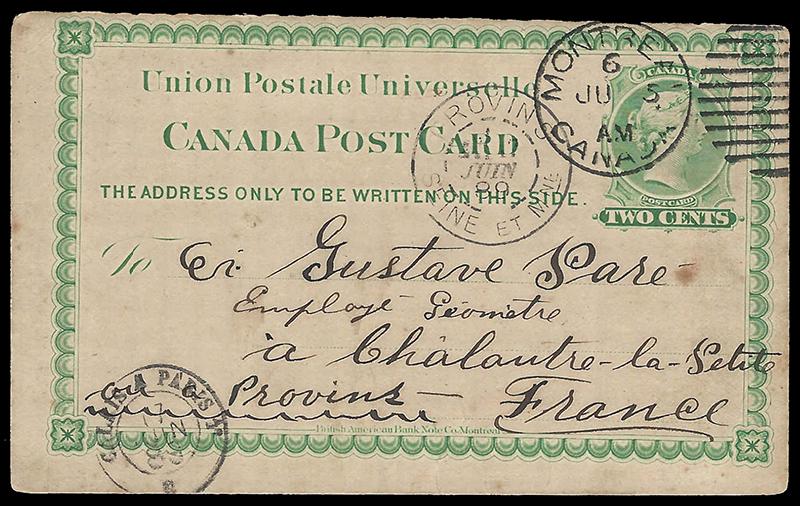 P4: 2¢ green UPU postal card from Montreal 5 JU '89 to FRANCE, French transit and Provins 17 JU receiver on front, one small stain, still very fine. (Image)