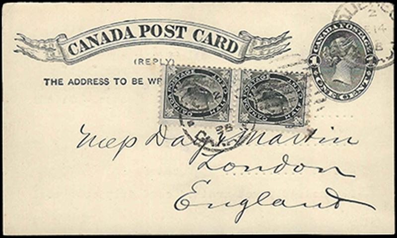 (P10): REPLY PORTION of 1¢ black Postal Card up-rated for Foreign Delivery with pair of mis-perforated ½¢ Leaf issue stamps, cancelled/tied by QUEBEC 14 DE ‘98 duplexes to London, ENGLAND, very fine and unusual. (Image)