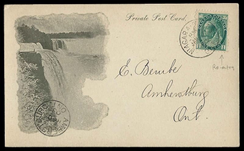 75var: 1¢ green with RE-ENTRIES at TOP and in both NUMERAL BOXES, tied by NIAGARA FALLS 3 JA 1903 cds to immaculate NIAGARA FALLS PRIVATE VIEW CARD (View 16) in DARK GREEN, scarce and very fine. (Image)
