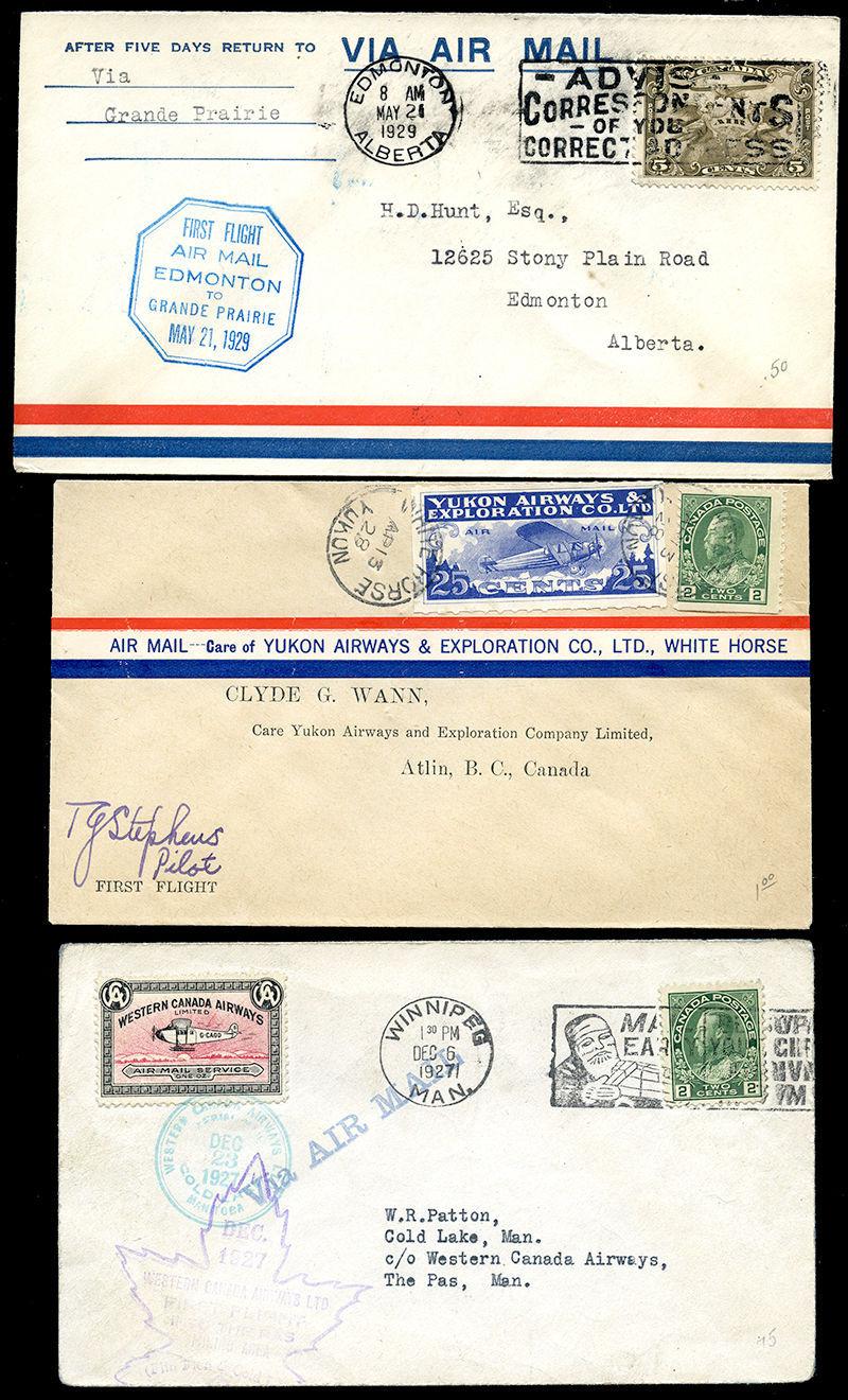 SEMI-OFFICIAL AIR MAILS: PATRICIA AIRWAYS AND EXPLORATION CO. LTD.: CL13: (25¢) green and red on yellow paper, 12 covers, tied by various cancels on backs, various combinations of 2¢ rate with Admirals on front. (Image)