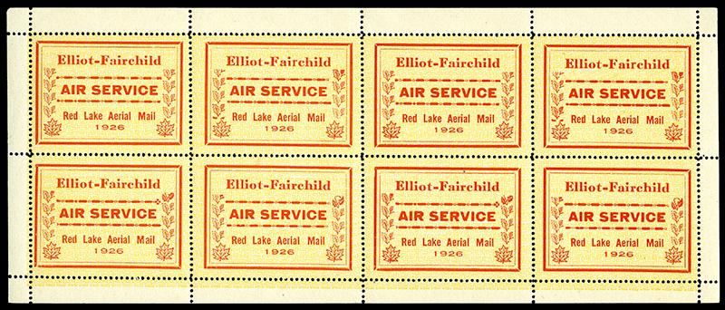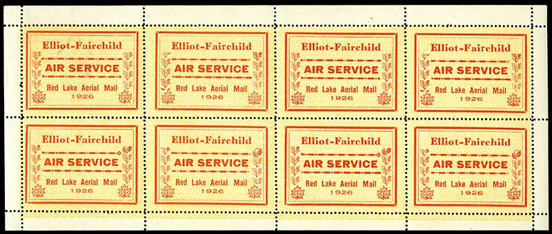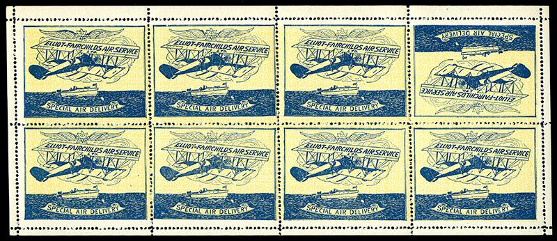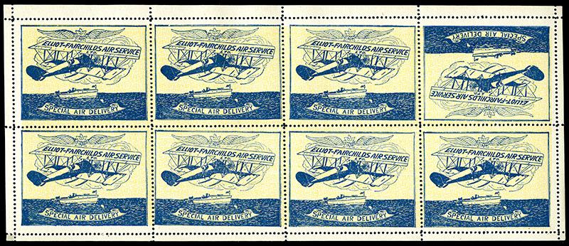 SEMI-OFFICIAL AIR MAILS: ELLIOT-FAIRCHILDS AIR SERVICE: CL9c,CL9d: (25¢) blue on yellow COMPLETE PANE OF 8 with upper right stamp INVERTED showing ‘filled-in wing’ variety (pos 1), nh, very fine (Image)
