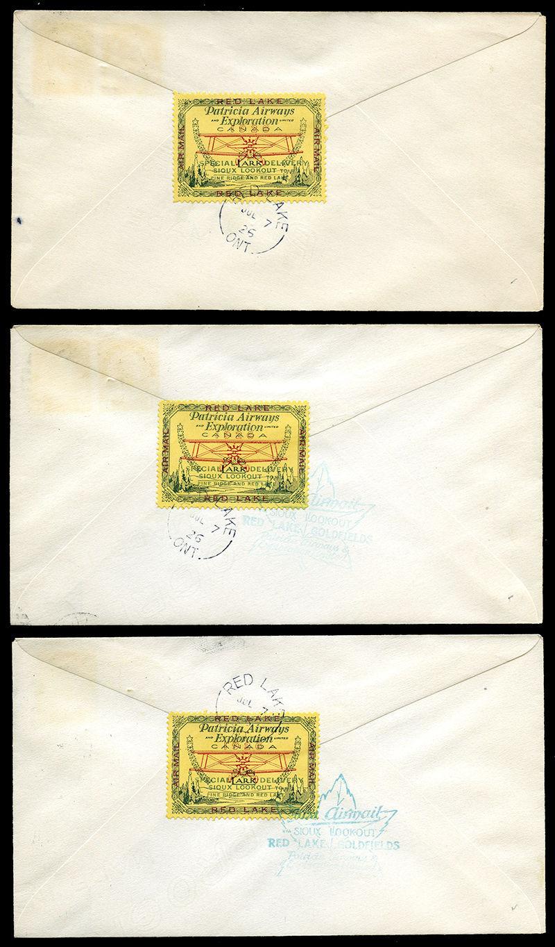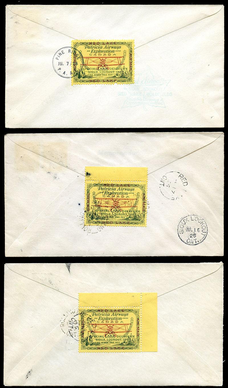 SEMI-OFFICIAL AIR MAILS: PATRICIA AIRWAYS AND EXPLORATION CO. LTD.: CL13: (25¢) green and red on yellow paper, six covers, tied by various cancels on backs, various combinations of 2¢ rate with Admirals on front. (Image)