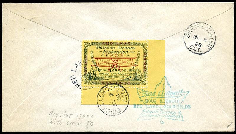 SEMI-OFFICIAL AIR MAILS: PATRICIA AIRWAYS AND EXPLORATION CO. LTD.: CL13b: (25¢) green and red on yellow paper, with SMALL "t" IN "TO", tied to back of cover with Red Lake, Sioux Lookout 7 JUL 26, and green cachet, 2¢ green Admiral tied by Red Lake 7 JUL 26 to North Toronto. (Image)