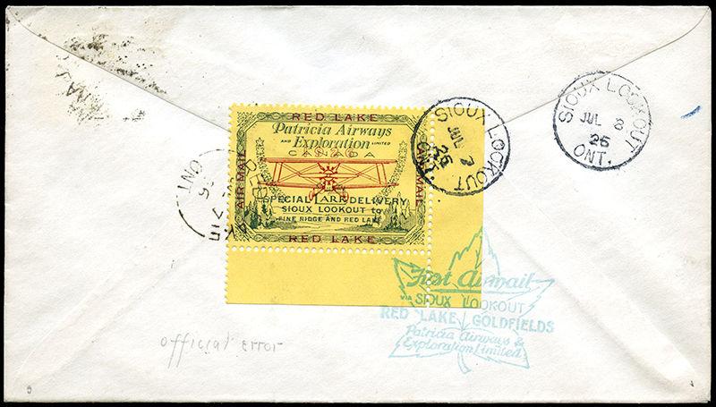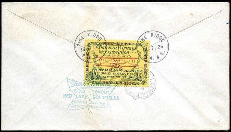 SEMI-OFFICIAL AIR MAILS: PATRICIA AIRWAYS AND EXPLORATION CO. LTD.: CL13c: (25¢) green and red on yellow paper, route inscription in BLUE-BLACK, tied by green cachet, Sioux Lookout, two Pine Ridge JU 7/26 P. A. & E. cancels on back, 2¢ green Admiral tied by same Pin Ridge cancel to Toronto. (Image)