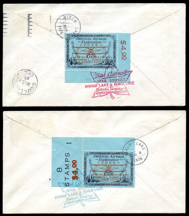 SEMI-OFFICIAL AIR MAILS: PATRICIA AIRWAYS AND EXPLORATION CO. LTD.: CL18: (50¢) dark violet and red on blue paper, two covers, one tied with green cachet UL Plate 1 corner margin copy with corrected red $4.00 over $2.00 in selvedge, the other LR corner margin copy with red cachet, and Birch Lake 2 AUG 1926 receivers, both with two 1¢ orange yellow pairs, one Sioux Lookout 2 Aug 26, the other Toronto 24 JUL 1926. (Image)
