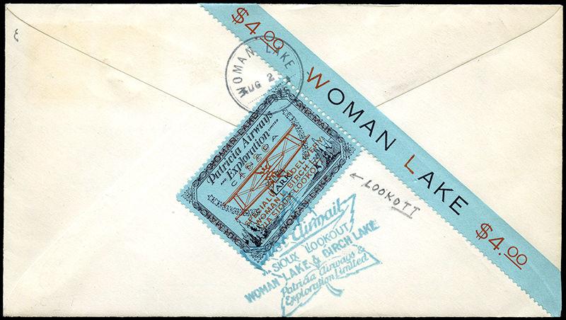 SEMI-OFFICIAL AIR MAILS: PATRICIA AIRWAYS AND EXPLORATION CO. LTD.: CL18c: (50¢) dark violet and red on blue paper, with OTT in LOOKOUT variety with full $4.00 WOMAN LAKE $4.00 selvedge, tied to back by Woman Lake 2 AUG 1926 and green cachet, 2¢ green Admiral tied by Sioux Lookout 2 AU 26 duplex to Woman Lake (Image)