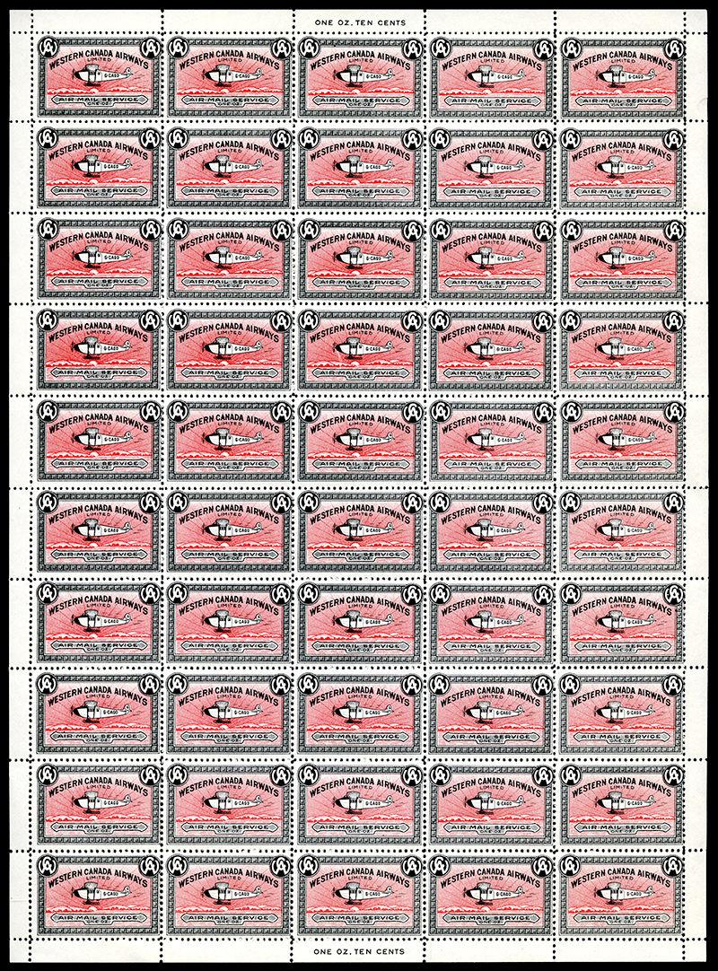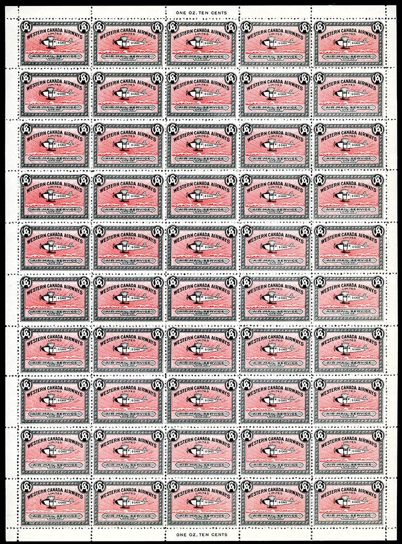 SEMI-OFFICIAL AIR MAILS: WESTERN CANADA AIRWAYS: CL40: (10¢) black and pink, COMPLETE SHEET OF 50, with 10 OZ. TEN CENTS imprint at top and bottom, nh, fine (Image)