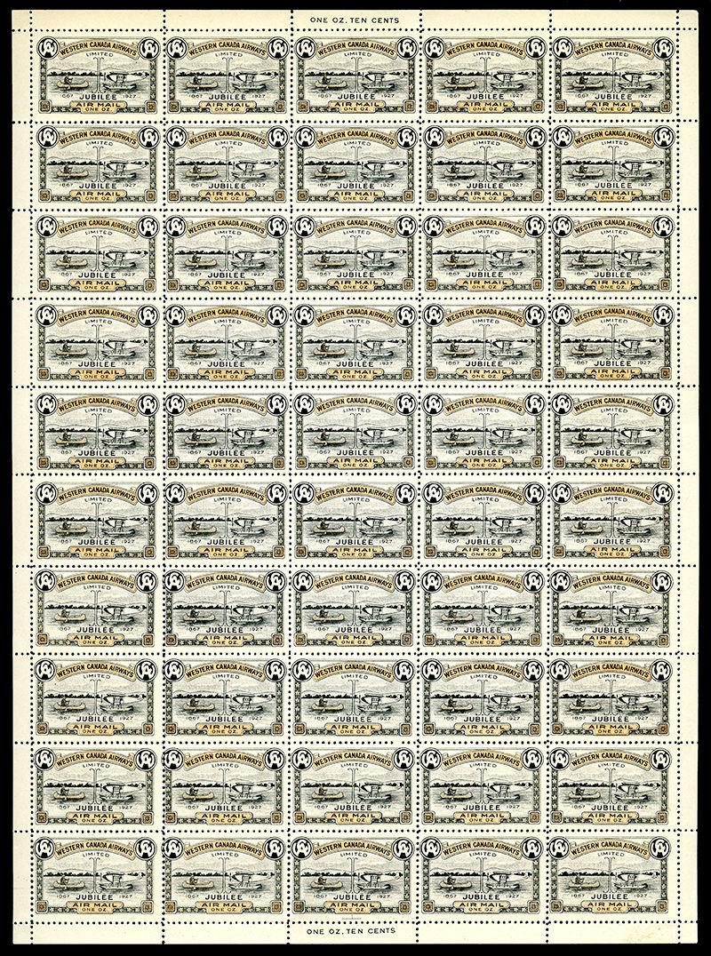 SEMI-OFFICIAL AIR MAILS: WESTERN CANADA AIRWAYS JUBILEE CL41: (10¢) black and orange COMPLETE PANE of 50, with 10 OZ. TEN CENTS imprint at top and bottom, nh, fine (Image)