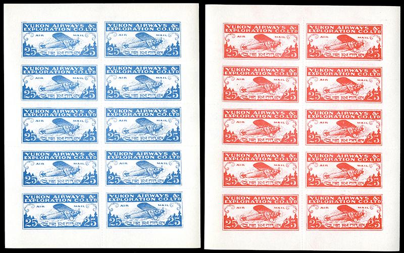 SEMI-OFFICIAL AIR MAILS: YUKON AIRWAYS AND EXPLORATION CO. LTD.: CL42: 25¢ Yukon Airways Rouletted Unofficial Reprints in blue, red, violet, and orange, 10 sets of four in complete sheets of 10 each, nh, mostly f-vf (Image)