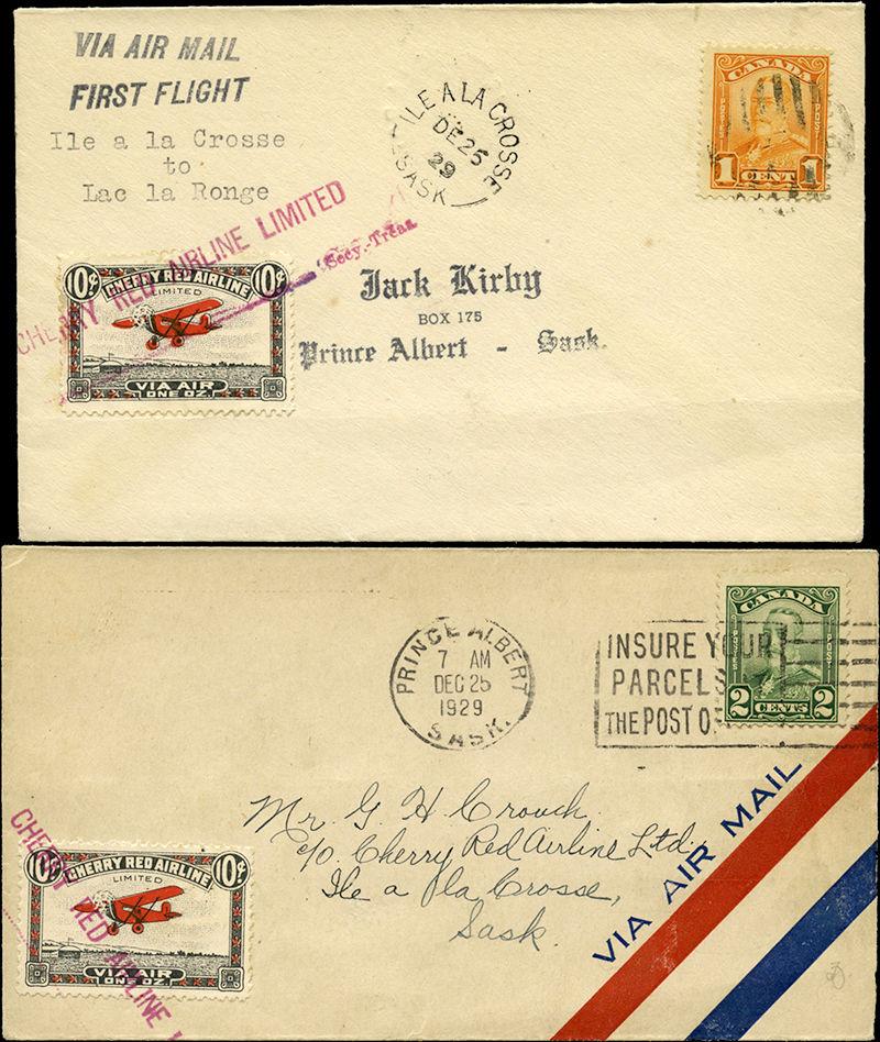SEMI-OFFICIAL AIR MAILS: CHERRY RED AIRLINE LTD.: CL46,CL46i: 10¢ red and black, two covers one with 1¢ Scroll tied by PRINCE ALBERT 25 DEC 1929 SASK. slogan other with 2¢ Scroll showing SNOW ON WINGS variety, with ILE A LA CROSSE 25 DEC 29 SASK cancel, and CHERRY RED AIRLINE LIMITED/ ______Secy. - Treas. red cancels, RARE Christmas cancels, f-vf. (Image)