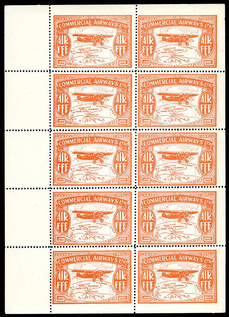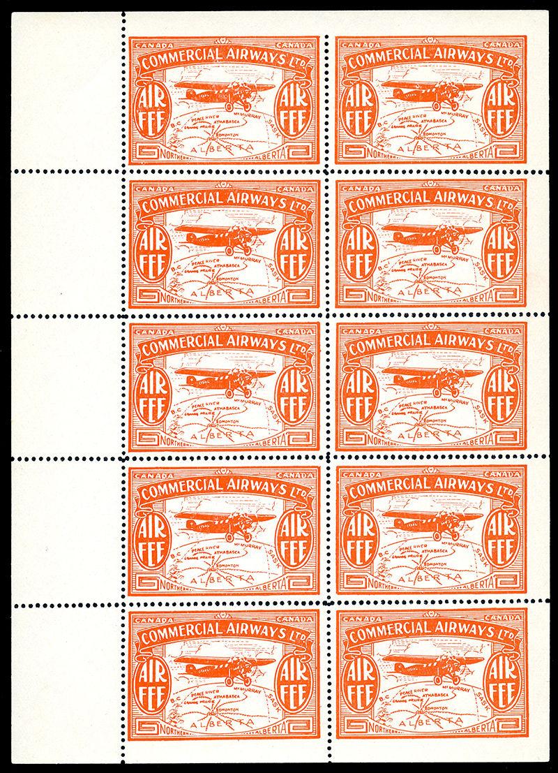 SEMI-OFFICIAL AIR MAILS: COMMERCIAL AIRWAYS LTD.: CL50,CL50d: (10¢) orange AIR FEE (10¢) cpl PANE OF TEN, showing the ‘break in oval’ variety at position 1, nh, very fine (Image)
