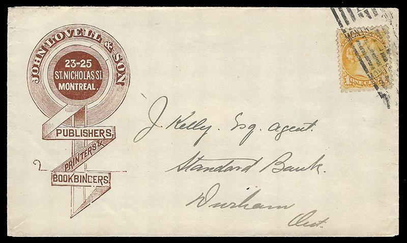 35: ONE CENT: YELLOW, paying 1¢ printed matter rate and tied by MONTREAL '11' roller to undated JOHN LOVELL PUBLISHERS, PRINTERS, BOOKBINDERS illustrated envelope to Durham, clean, scarce and very fine. (Image)