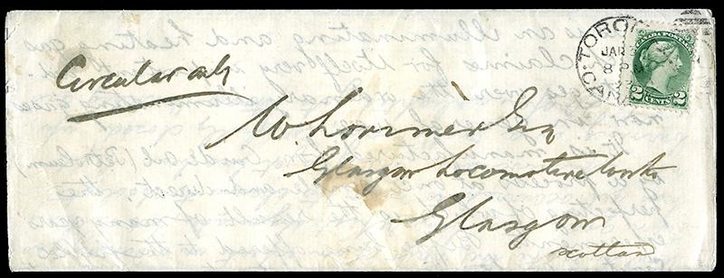 36: TWO CENT: GREEN, tied by Toronto 3 JA 92 duplex to folded duplicated ‘hand-written’ NON-EXPLOSIVE GAS advertising letter, marked ms 'Circular only' UL and addressed to Glasgow SCOTLAND, very rare 2¢ CIRCULAR RATE. (Image)