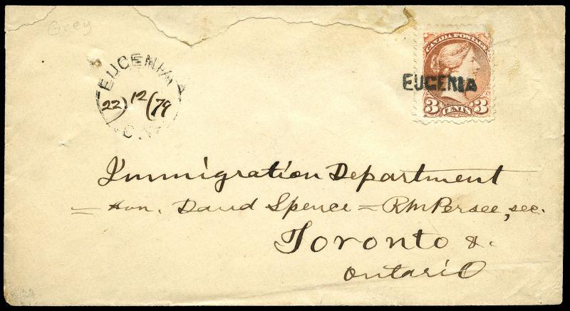 37: THREE CENT: ORANGE RED, tied to cover by EUGENIA straight line, EUGENIA C. W split ring 22)12(79 manuscript, to Toronto, 24 DEC 7(x) receiver, opening tears. (Image)