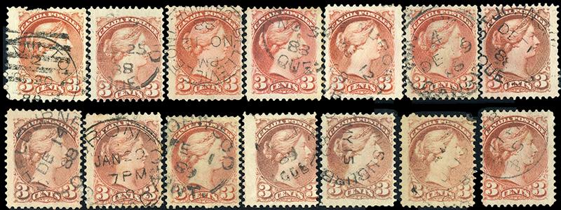 41a,41i: THREE CENT: ROSE CARMINE or DEEP ROSE CARMINE shades, fourteen copies all dated Oct 88 to May 89, few small faults, otherwise attractive and f-vf. (Image)