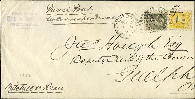 42,35: 1¢ yellow and 5¢ grey tied to large, reduced at right, cover by TORONTO CANADA NOV 3 4PM 88 “1” duplex, DON 1722. Endorsed "PARCEL POST NO CORRESPONDENCE / Mitchell & Dean". Violet corner h/s “From the Office of the Clerk in Chambers, Osgoode Hall, Toronto”, to Guelph. RARE USAGE, probably for legal documents. (Image)