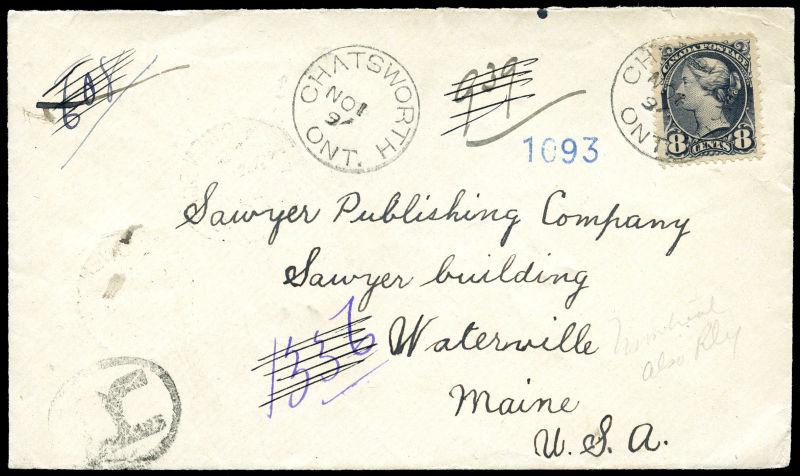 44: EIGHT CENT: VIOLET BLACK, tied by CHATSWORTH ONT. 1 NO 97 to Registered cover, R in oval, to Waterville Maine USA, TOR & OWEN SOUND M.C. (#)5 1 NO 97, TORONTO ONT. NT 1 NO 97, MONTREAL CANADA 2 NO 97 P12 barred circle or squared circle precursor, and violet oval PORTLAND, ME. 4 NOV 1897 REGISTERED oval, (Image)
