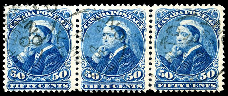 47: FIFTY CENT: BLUE, strip of three with TORONTO 21 SP 95 cds cancels, almost very fine (Image)