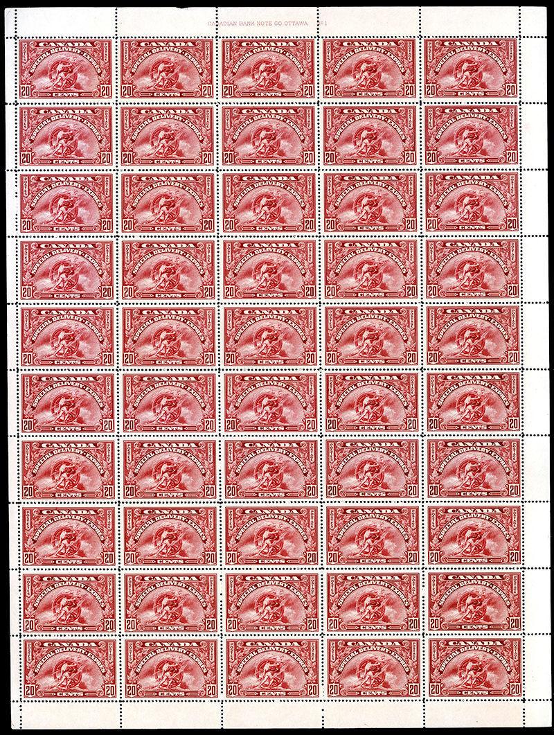SPECIAL DELIVERY: E6: 1935 issue, 20¢ dark carmine, Plate No. 1 UR folded sheet of 50, small selvedge fault at top, nh, almost very fine. (Image)