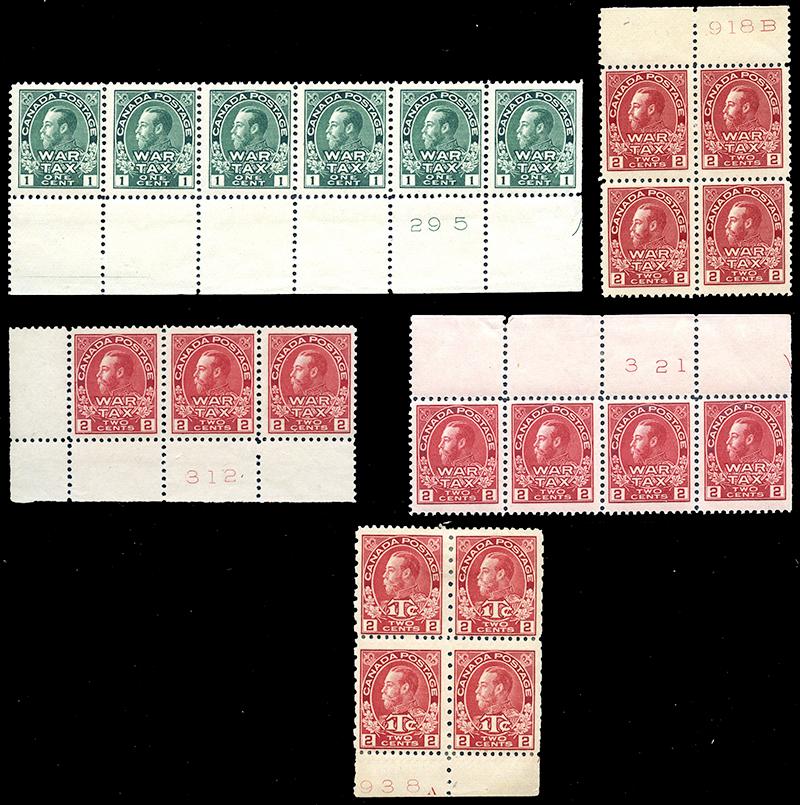 WAR TAX: MR1/MR5: Five blocks of strips with Plate (Printing Order numbers), f-vf. ex Lum. (Image)