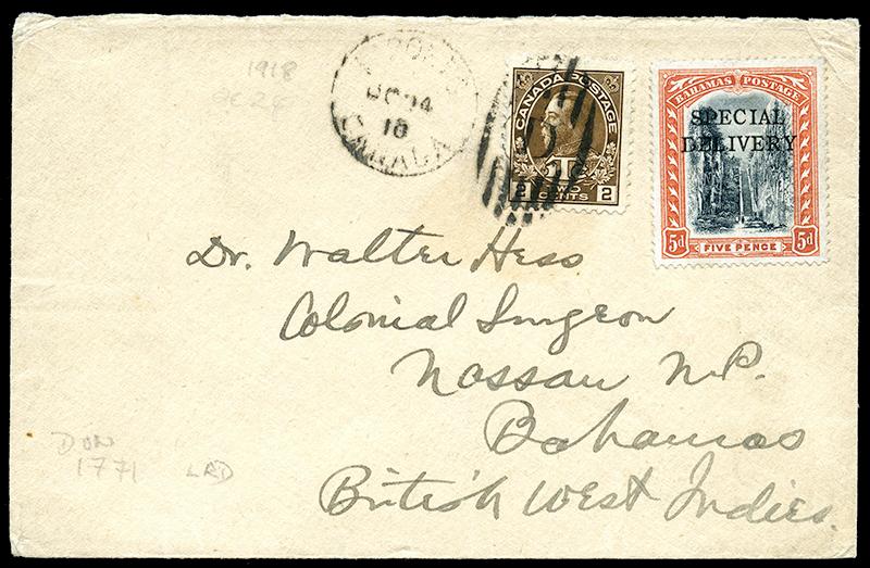 WAR TAX: MR4,BAHAMAS E1: 2¢ + 1¢ brown, die II, tied by Toronto 24 OC 18 Canada 'D' duplex (DON 1771 LRD), plus Bahamas 5d orange Special Delivery (1987 Original Canada Specialized SD1), to Nassau BAHAMAS, 30 OCT 18 receiver. (Image)