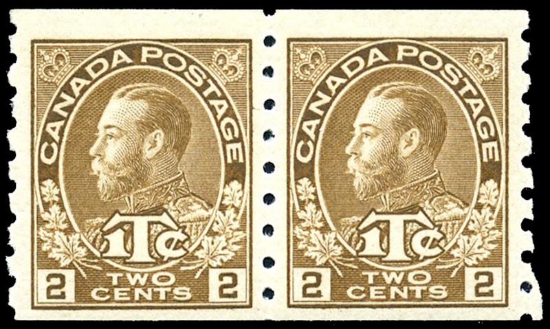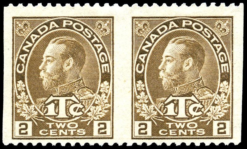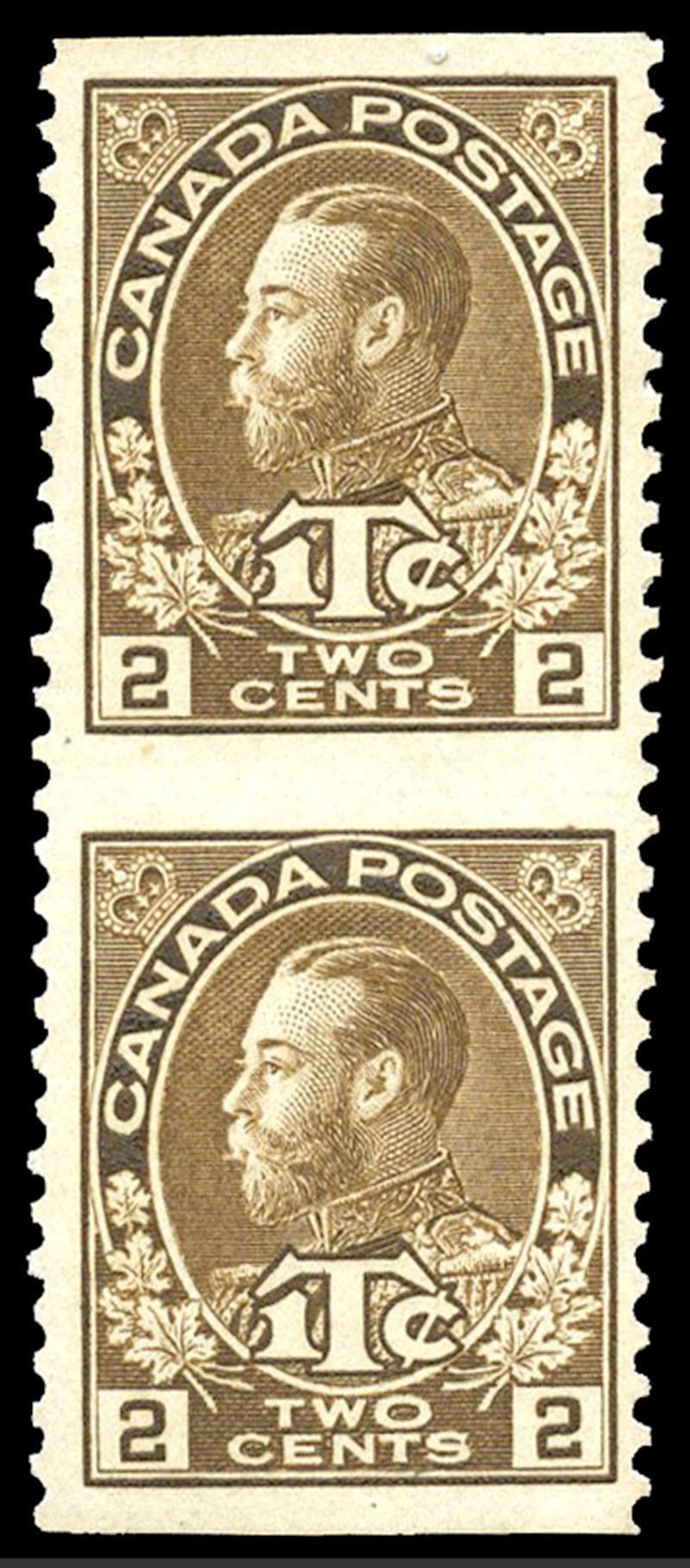 WAR TAX: MR4iii: 2¢ + 1¢ brown, die I, horizontal pair IMPERFORATE VERTICALLY, without gum as issued, almost very fine. 2025 Gratton Cert (Image)