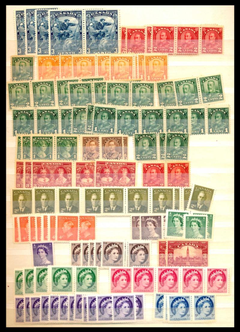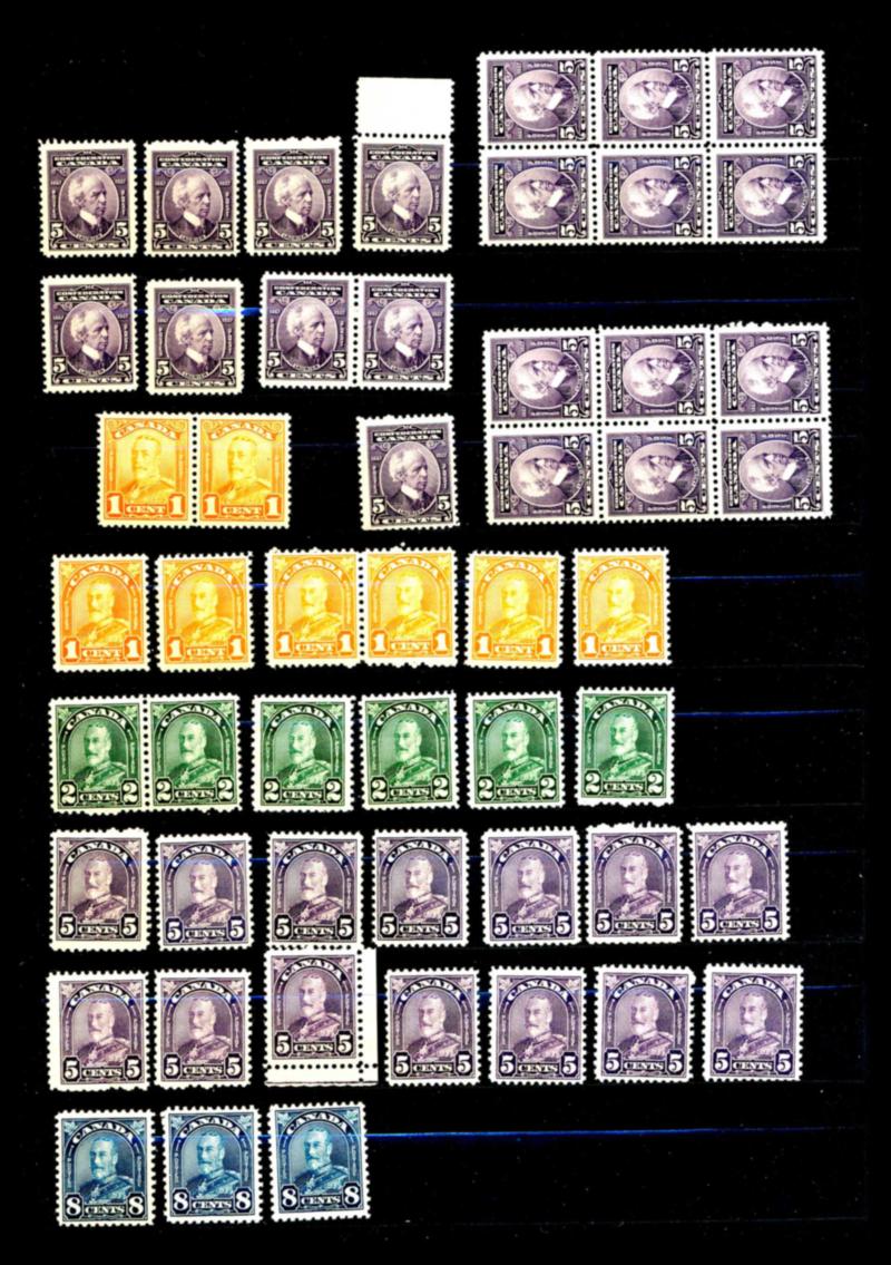 CANADA ACCUMULATION, STAMPS F-VF **. Stockbook containing few hundred stamps mint never hinged, I noted #143 x2, 149 x11, 150 x14, 162 x14, 163 x14, 164 x3, + face value of $60 ++. Starting bid $50.00. (Image1)