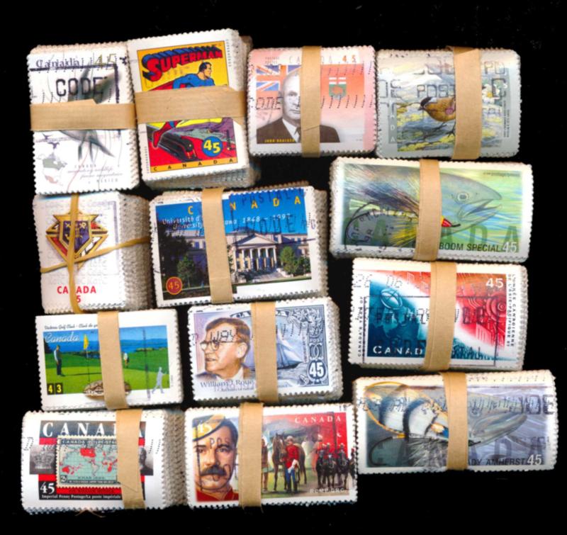 CANADA ACCUMULATION STAMPS IN BUNDLES F-VF /O. 3 Boxes containing hundreds of bundles of 100 used modern commemorative stamps. Starting bid $170.00. (Image1)