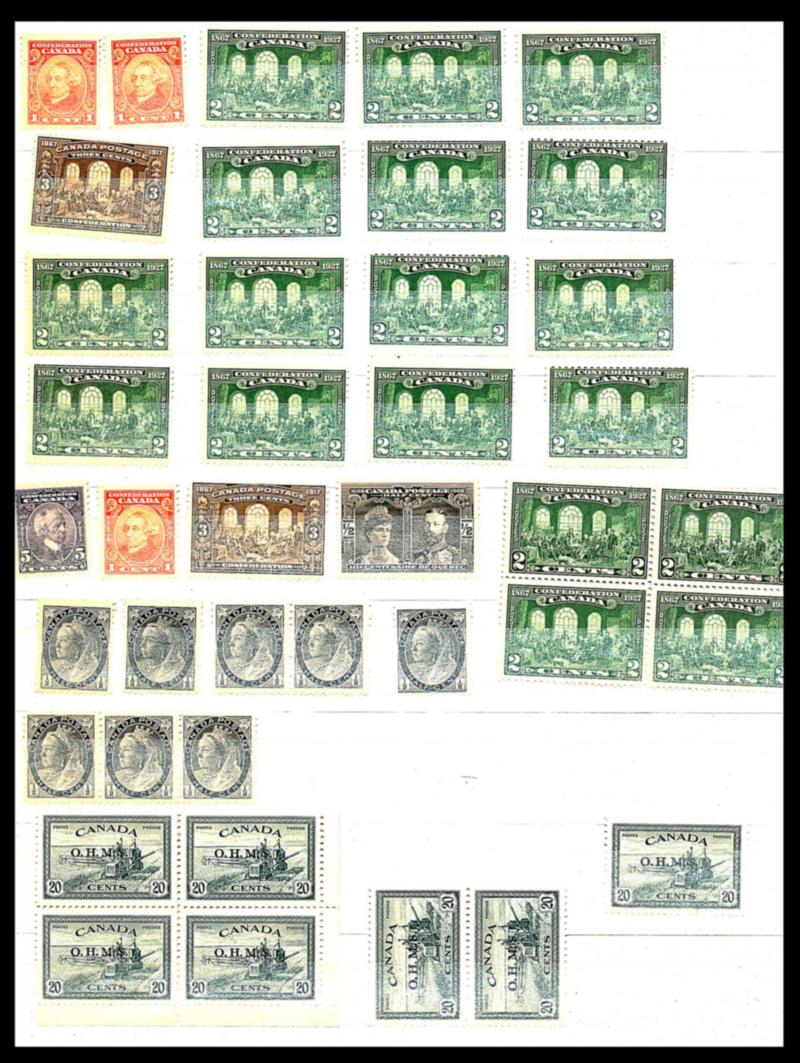 CANADA ACCUMULATION, STAMPS F-VF **. Stockbook containing few hundred stamps mint never hinged. Some important duplication. I noted #339 plate block 1 x100, #O8 x7, O22 x3, O21 x23, O32 X11 + other Official stamps. Starting bid $100.00. (Image1)