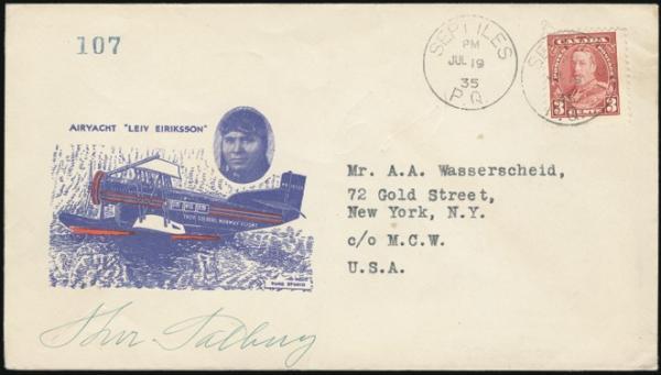 219, Tied by Sept Iles PQ 19 July 1935 machine cancel on cacheted cover for the Trans-Atlantic Flight by the Norwegian Pilot THOR SOLBERG in his amphibian plane 'LEIV EIRIKSSON". The flight traced the route of the Viking explorer Leiv Eiriksson. This cover is Pilot Signed & addr to New York. F (AAMC #3517) (Image)