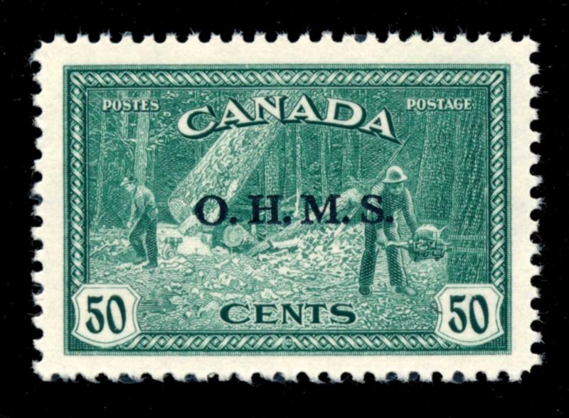 CANADA 1949-50 #O9 STAMP VF **. Peace issue, 50 cents Logging, BC. The stamp is overprinted O.H.M.S., mint never hinged and very well centered. Unitrade $330.00. (Image1)