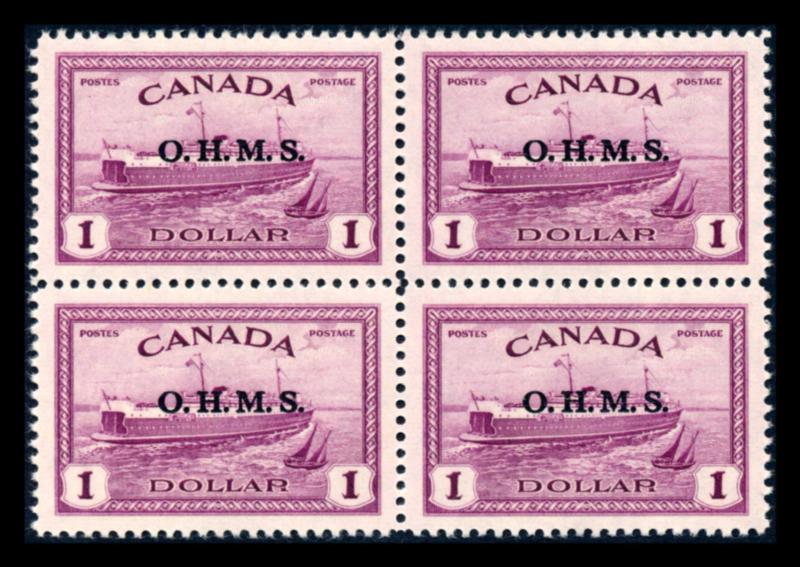 CANADA 1949-50 #O10 IN BLOCK STAMPS VF **. Overprinted Official Peace issue, $1 Train Ferry. Block of 4 stamps mint never hinged. Unitrade $480.00. (Image1)