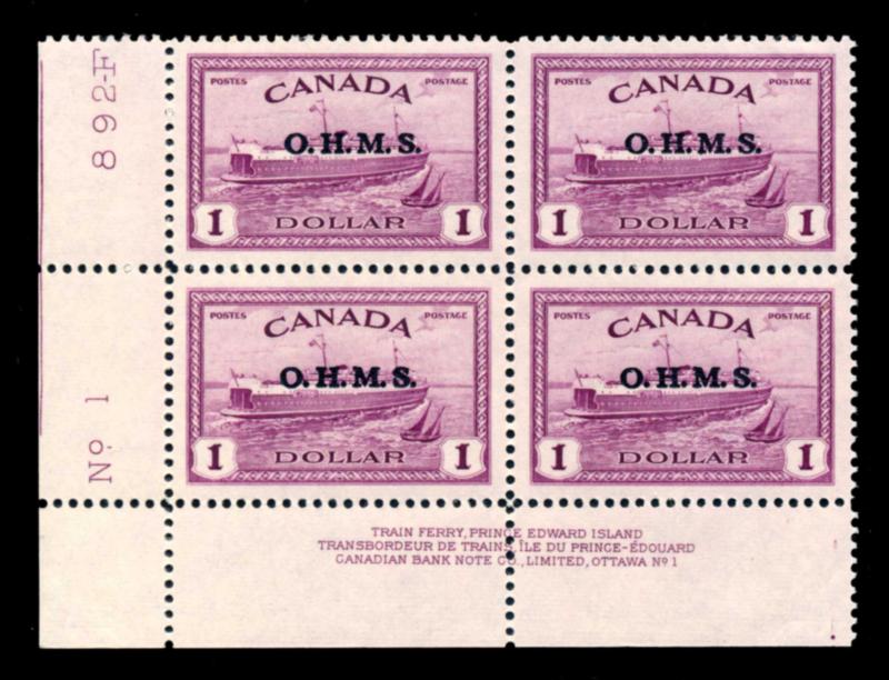 CANADA 1949-50 #O10 PLATE BLOCK STAMPS VF **. Peace issue, $1 Train Ferry overprinted O.H.M.S. Lower left plate block of 4 stamps mint never hinged. Unitrade $700.00. (Image1)