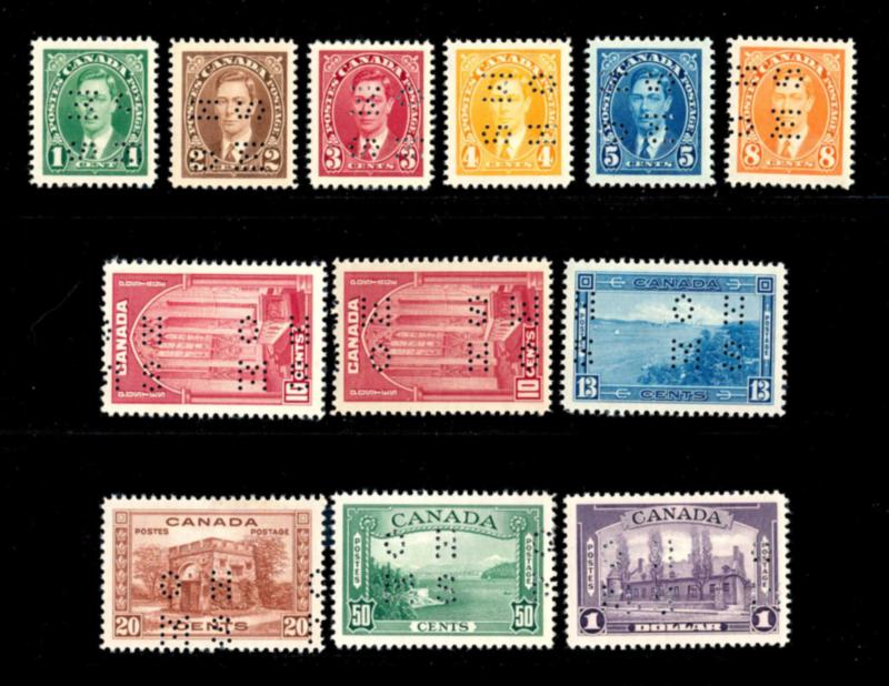 CANADA 1937-38 SET #O9/231-O9/245 STAMPS VF *. King George VI Pictorial issue, Official perforated set of 12 stamps mint lightly hinged. Unitrade $660.00. (Image1)