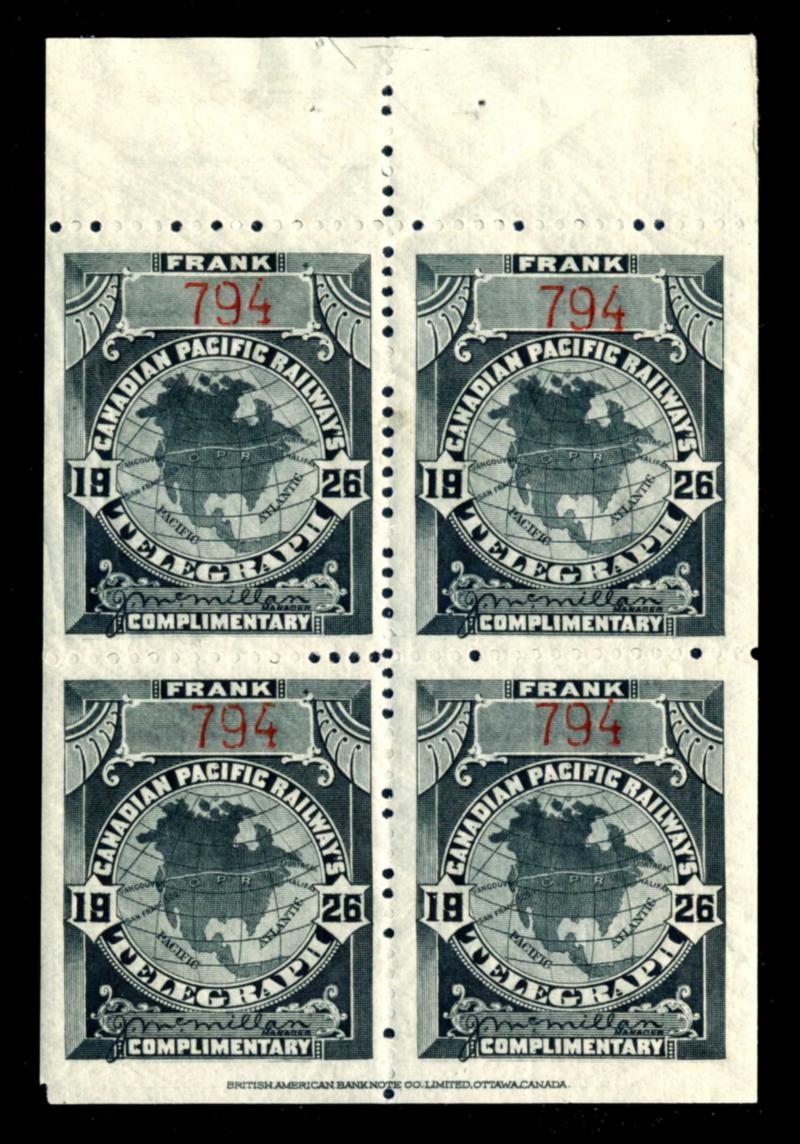 CANADA REVENUE 1926 #TCP39 BOOKLET PANE STAMPS F-VF **. Canadian Pacific Railways, Telegraph Franks, booklet pane with tab of 4 stamps mint never hinged. Natural gum wrinkles. Van Dam $780.00. (Image1)