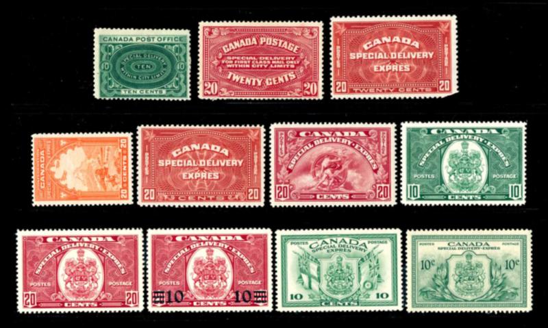 CANADA 1898-1946 #E1-11 STAMPS F-VF */**. Special Delivery issue, complete set of 11 stamps mint never hinged except for #E1-2 and #E10-11 that are hinged. Unitrade $535.00. (Image1)