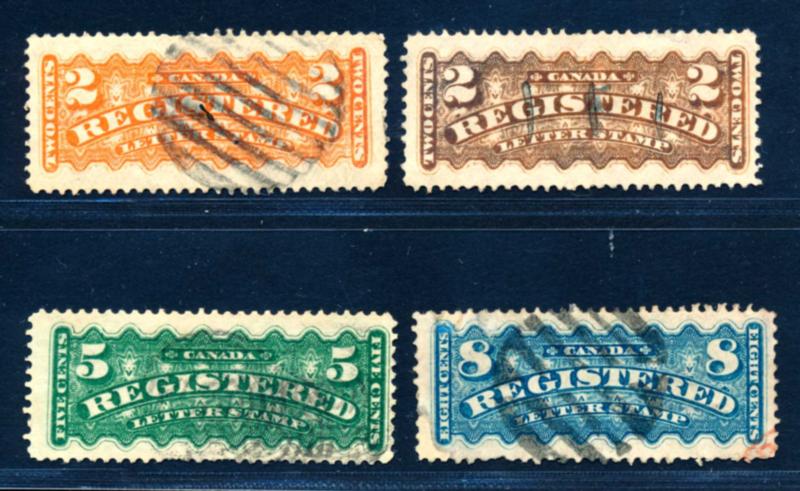 CANADA 1875-96 #F1-3 STAMPS F-VF /O. Registration issue selection of 4 used stamps. Starting bid $50.00. (Image1)