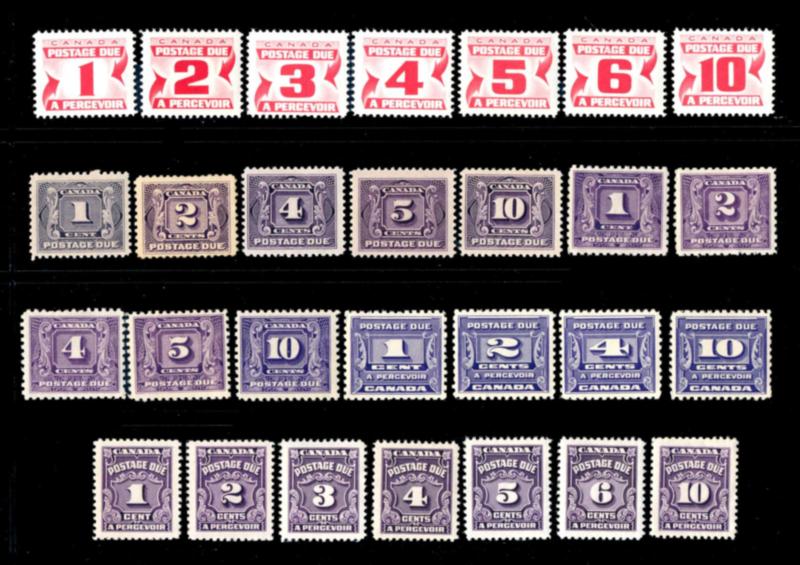 CANADA 1906-67 #J1-27 STAMPS F-VF */**. Postage Due issue, 5 complete sets of 28 mint stamps. #J3, 4, 5, 7 and 12 are lightly hinged. Unitrade $577.00. (Image1)