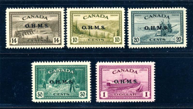 CANADA 1949-50 SET #O6-10 STAMPS VF **. Peace issue overprinted "O.H.M.S.". Complete set of 5 stamps mint never hinged. Unitrade $540.00. (Image1)